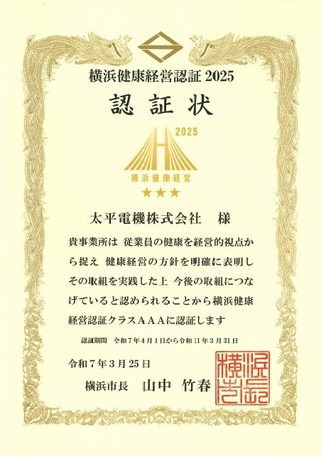 この度、太平電機株式会社は、横浜市より「健康経営認証2021」 クラスAA の認証事業所 として認定されました。