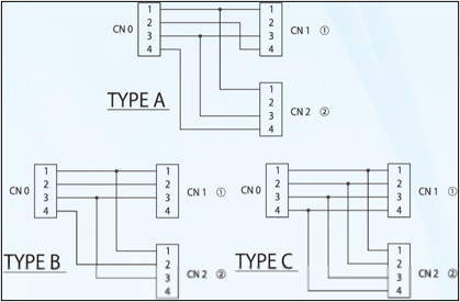 ①:分岐用コネクタにより、Y字分岐が可能 ②:産業機器や工作機器のセンサーの分岐が可能に ③:回路はTYPE A~C、他、5Pinの対応等が可能