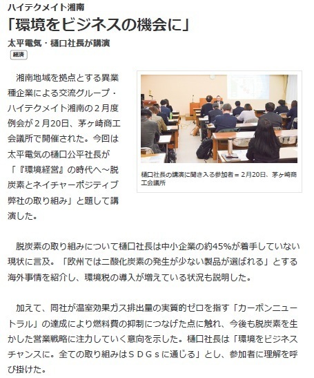 弊社社長が、カーボンニュートラル達成までの弊社の取り組みやネイチャーポジティブの弊社の取り組みを基に茅ヶ崎市内の企業がそれらに取り組める参考になる講演を実施いたしました。
