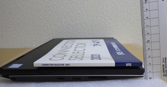 右の写真のようにノートパソコンを閉じた厚さと比較すると、このカタログは薄くて軽いのでデスクの片隅でも邪魔になりません。