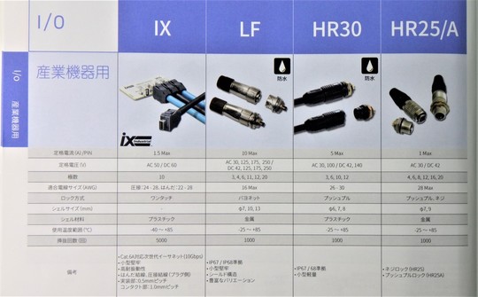 右の写真は、カタログ一部抜粋です。製品写真の下に、 極数や適合電線サイズ(AWG)などが記載されており、 とても見やすくなっております。